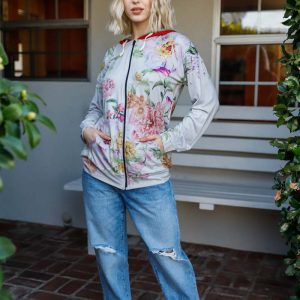 Grey Pink Flower Print Contrast Double Hood Sweater