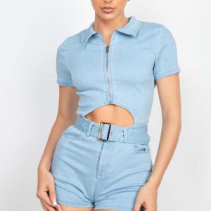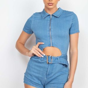 Belted Zip-Up Denim Romper