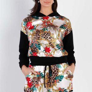 Black & Ivory Satin Effect Animal Print Hooded Top & Short Set