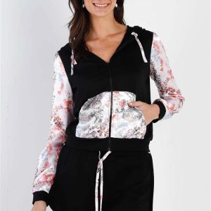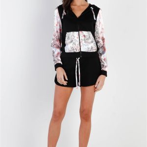 Black & Multi Color Print Colorblock Zip-Up Hooded Top & Short Set