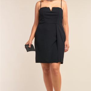 Plus Size Black Sleeveless V-Shaped Front Detail Side Slit Tight Fit Mini Dress