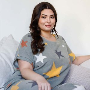 Plus Sage Star Print Flannel Loose T-Shirt & Sweatpants Set