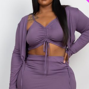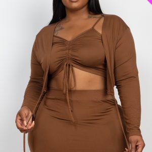 Plus Size Ruched Drawstring Cami Top & Skirt Set With Cardigan