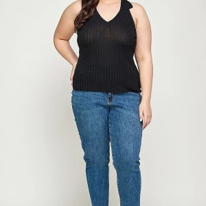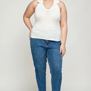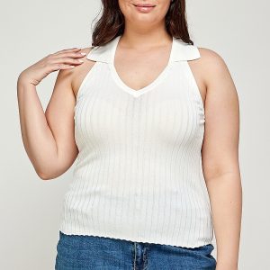 Plus Size, Solid Ribbed Knit Polo Sleeveless Top