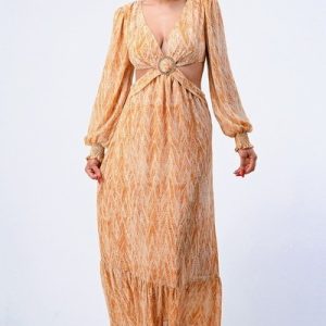Printed V Neck Self Belted Side Cut Out Ruffled Maxi Dress