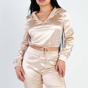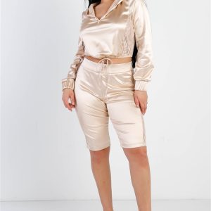 Satin Lace Details Long Sleeve Hooded Crop Top & Biker Short Set