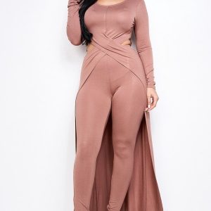 Solid Heavy Rayon Spandex Long Sleeve Crossed Over Long Top And Leggings 2 Piece Set