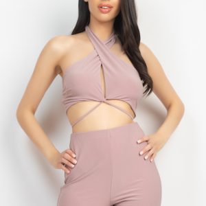 Solid Halter Top And Elastic Leggings Set