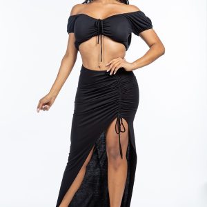 Solid Ruched Front Off The Shoulder Short Sleeve Cropped Top And Side Ruched Asymmetrical Skirt Two Piece Set
