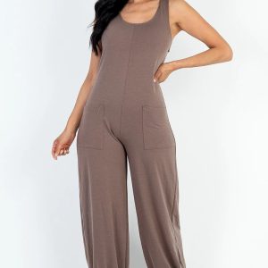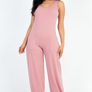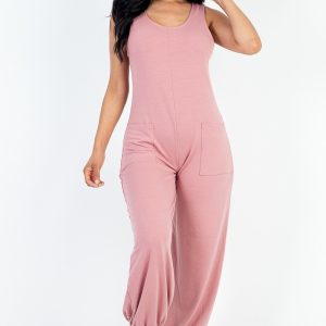 Casual Solid French Terry Sleeveless Scoop Neck Front Pocket Jumpsuit