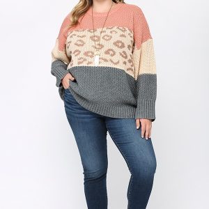 Color Block And Leopard Pattern Mixed Pullover Sweater