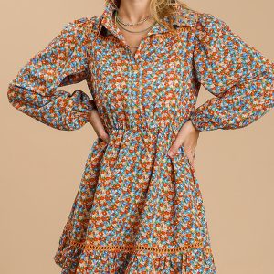 Collared Neckline Button Down Floral Print Dress With Crochet Trimmed Details