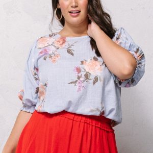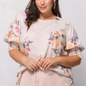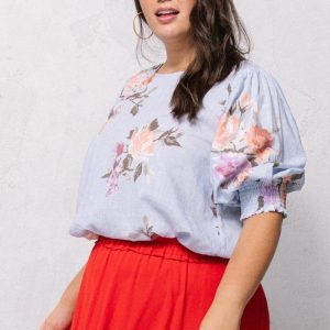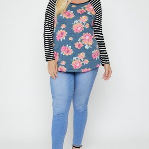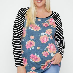Floral Top Featuring Raglan Style Striped Sleeves And A Round Neck