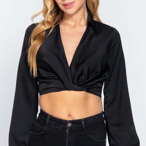 Long Sleeve Notched Collar Front Twisted Detail Crop Woven Top