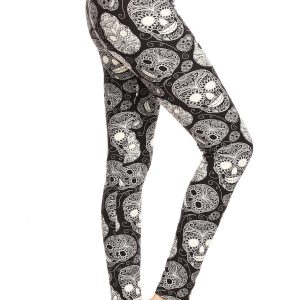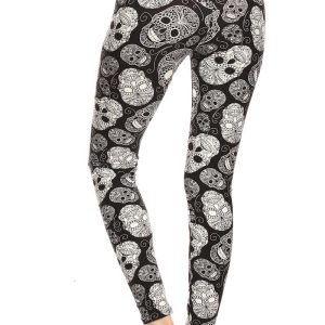 Long Yoga Style Banded Lined Skull Printed Knit Legging With High Waist