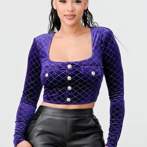 Lux Diamon Velvet Buttons Open Back Square Neck Long Sleeves Cropped Top