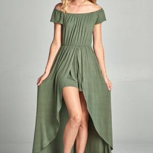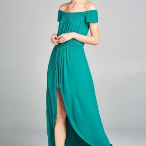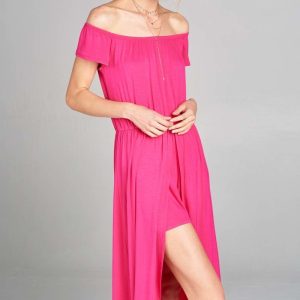 Off Shoulder Ruffled Denim Dress With Frayed Hem & Pockets