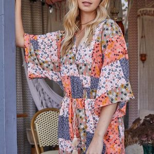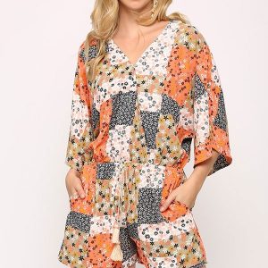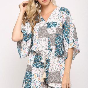 Patchwork Printed Surplice Romper With Waist Tassel Tie And Bottom Lining