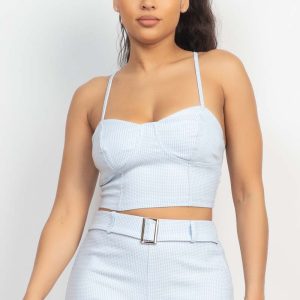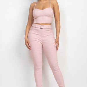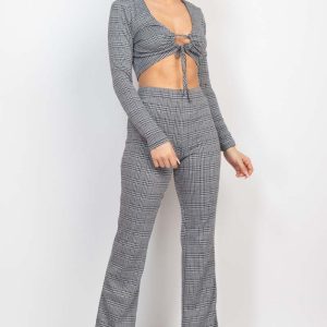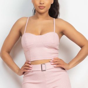 Plaid Houndstooth Cami Crop Top & Belted Pants Set