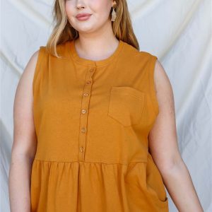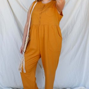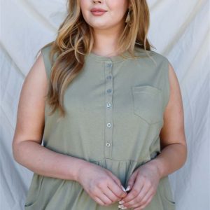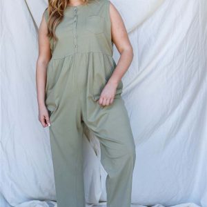 Plus Cotton Front Button Up Detail Sleeveless Jumpsuit