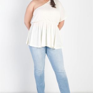 Plus Cream Textured One Shoulder Elasticized Waist Flare Hem Top